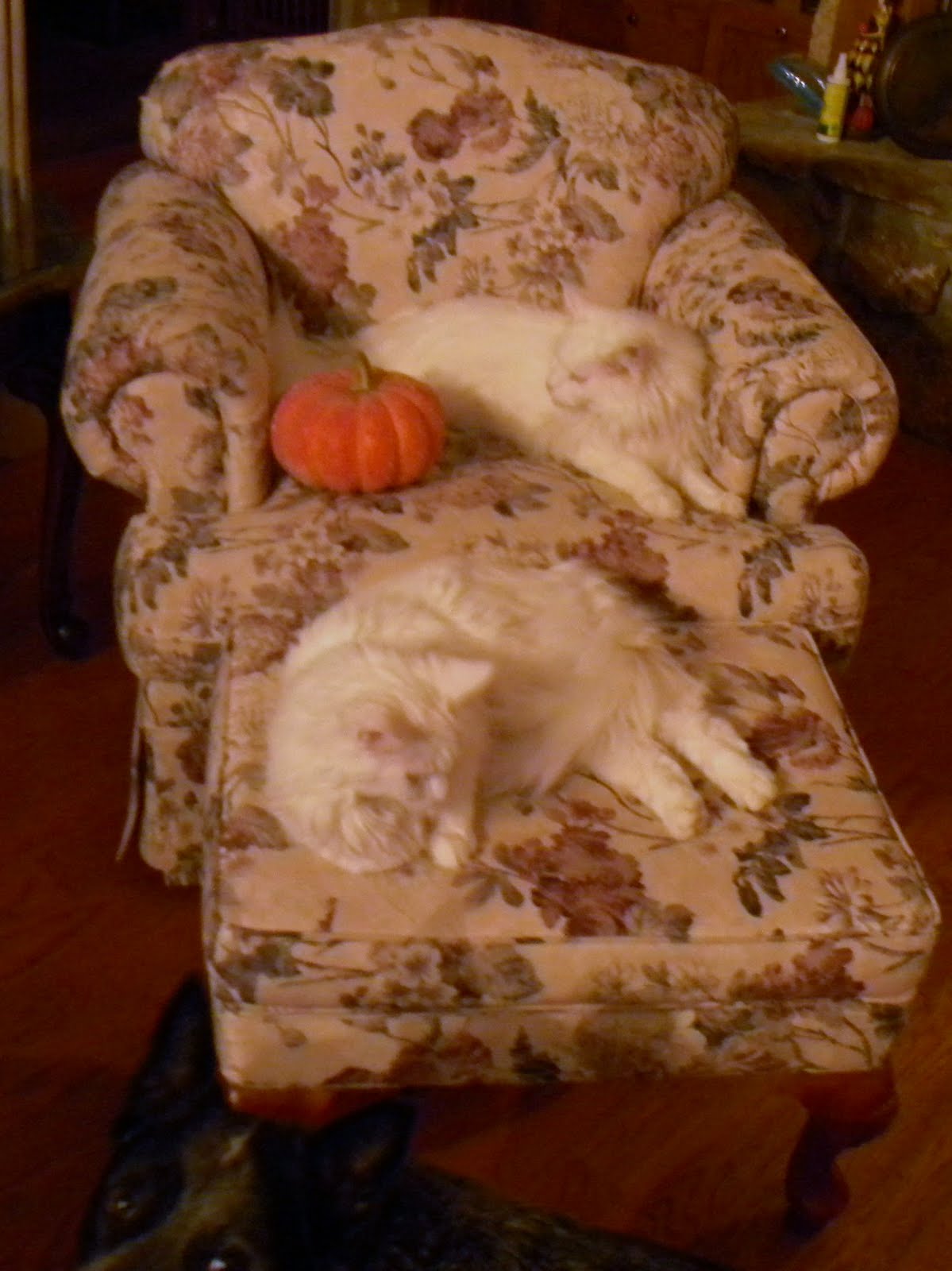 Fun post – you all look so cute. We love the kitties on the chair with the pumpkins best.Tail wags and Happy Halloween, the OP Pack