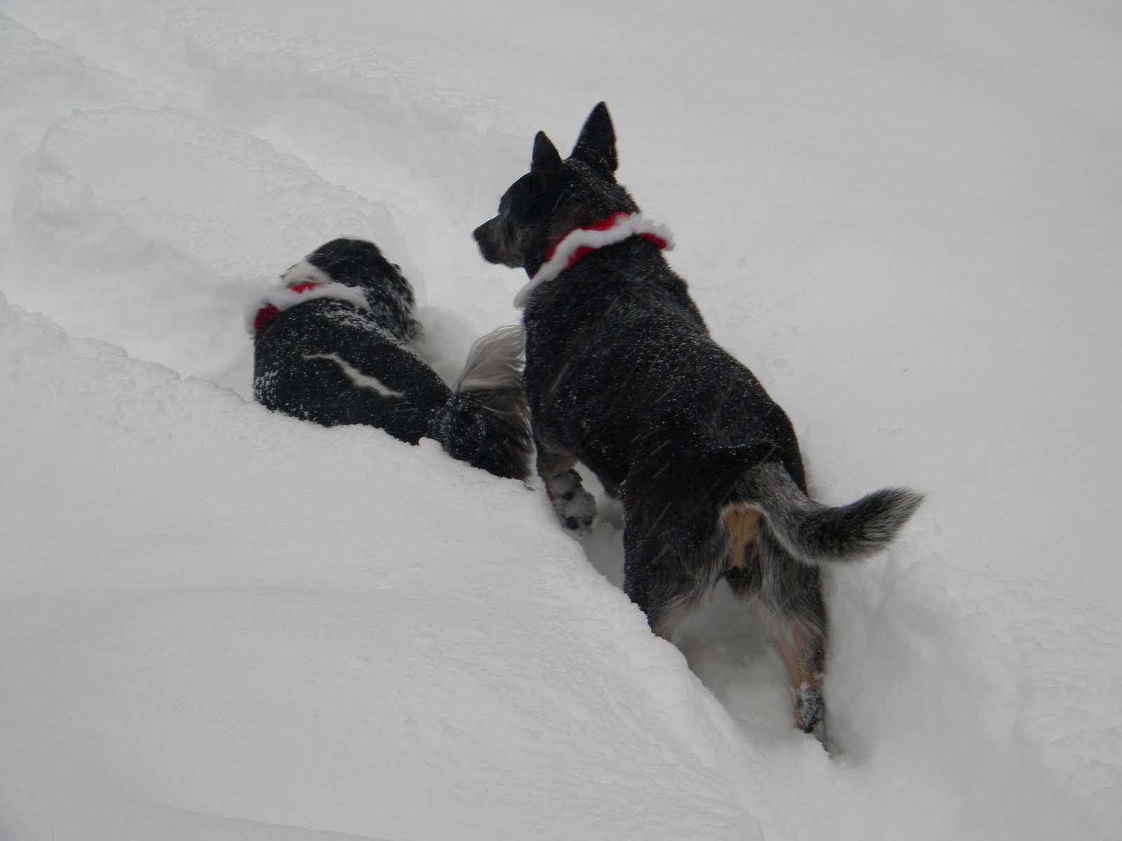 That looks like fun, they really seem to enjoy the white stuff. Mr. Chips is smart, even with the red sweater he might get lost under all that snow.