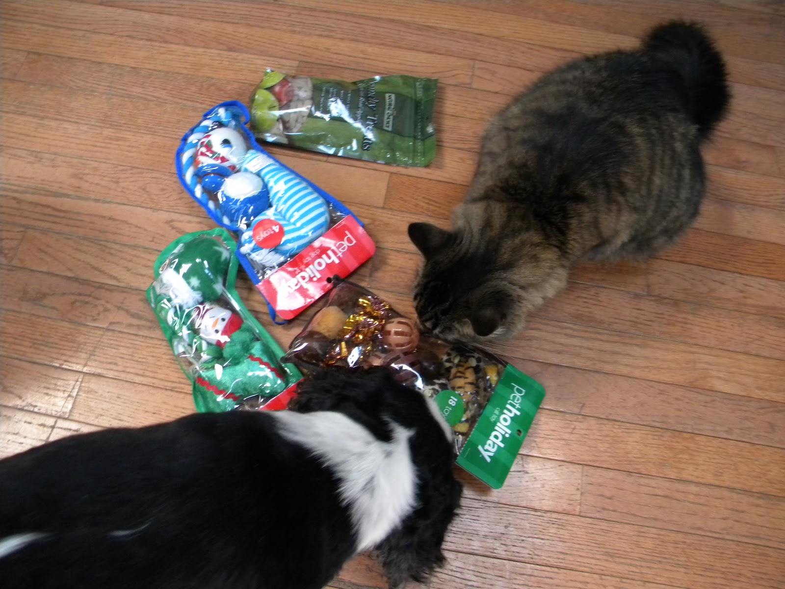 Santa Paws and Santa Claws at work! It looks like the \”kids\” know what to do with them! ☺
