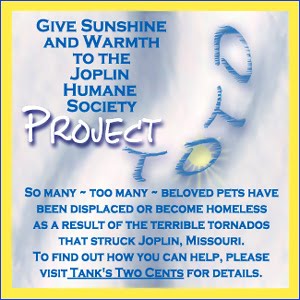 Hello my friends, as many of you remember a few weeks ago, there was an EF-5 tornado that hit Joplin, MO and the damage was horrifying. I heard thru the blog world, over at Tanks blog, that the Joplin Humane Society was in need for fleece for all the displaced animals that they are taking care of. If you want to help out yourself, please go here! Once you do, you can display this nice badge on your blog too!