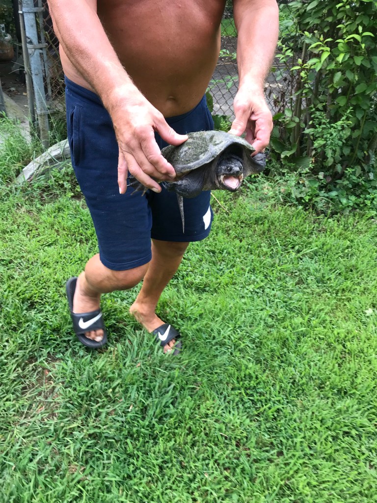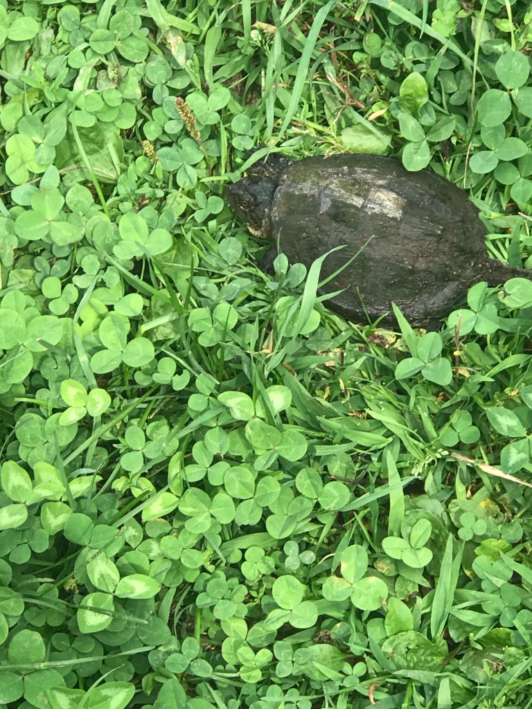 Today we had lots of snapping turtles in the yard. I’m not sure why but they are out and about. This one was a little bit still fisty! I had on big orange gloves and he still bit me, or tried to! So the next step was to use my horse manure pick!
