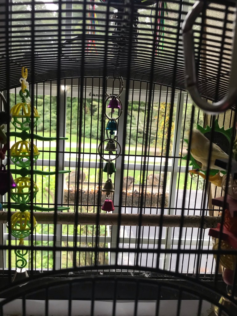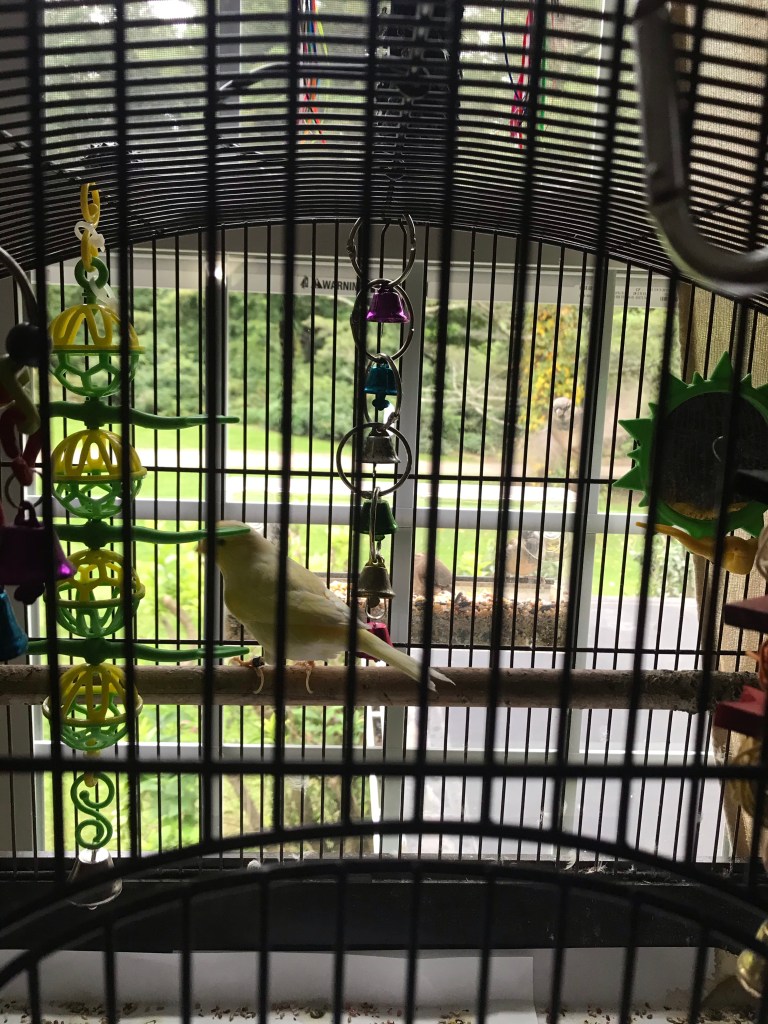He will sit on his perch and watch his little visitors. Heβs very vocal too! Singing all day. Not a sing-songy voice but more of a chirping. He is especially loud if I have music on or the TV. You may ask is it annoying? Only sometimes, when Iβm on the phone with a client or early Sunday morning when your trying to sleep late!π